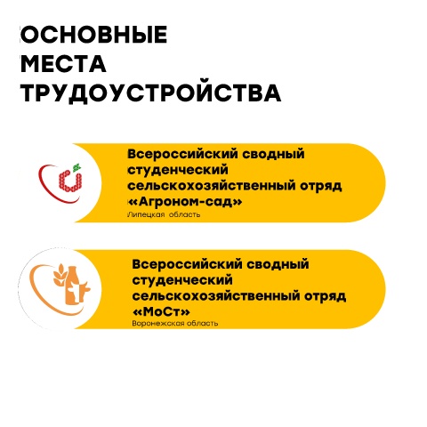ОСНОВНЫЕ МЕСТА ТРУДОУСТРОЙСТВА Всероссийский сводный студенческий сельскохозяйственный отряд « Агроном - сад » Липецкая область Всероссийский сводный студенческий сельскохозяйственный отряд « МоСт » Воронежская область