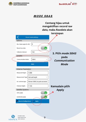 MODE SBAS Centang hijau untuk mengaktifkan record raw data, maka Rawdata akan tersimpan 3. Pilih mode SBAS pada Communication Mode Kemudain pilih Apply STONEK S580 GNSS RECEI VER 9 USER MANUAL