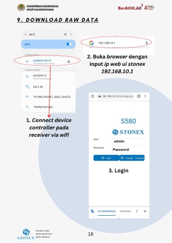 9. DOWNLOAD RAW DATA 2. Buka browser dengan input ip web ui stonex 192.168.10.1 1. Connect device controller pada receiver via wifi admin Password 3. Login STONEK S580 GNSS RECEI VER 16 USER MANUAL