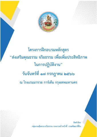 3 โครงการฝึกอบรมหลักสูตร “ส่งเสริมคุณธรรม จริยธรรม เพื่อเพิ่มประสิทธิภาพ ในการปฏิบัติ งาน” วันจันทร์ที่ 17 กรกฎาคม 2566 ณ โรงแรมมารวย การ์เด้น กรุงเทพมหานคร จัดท าโดย กลุ่มงานคุ้มครองจริยธรรม กองการเจ้าหน้าที่ กรมพัฒนาที่ดิน
