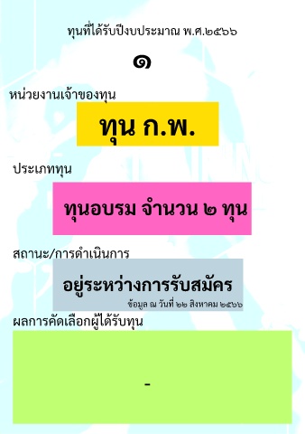 ุ ทนทไดรับปงบประมาณ พ.ศ.๒๕๖๖ ี ้ ๑ ้ หน่วยงานเจาของทน ุ ทุน ก.พ. ประเภททน ุ ทุนอบรม จานวน ๒ ทุน ํ ํ สถานะ/การดาเนินการ ่ อย่ระหวางการรับสมคร ั ู ิ ้ ั ี ขอมูล ณ วนท ๒๒ สงหาคม ๒๕๖๖ ื ั ผลการคดเลอกผไดรับทน ู้ ุ ้ -