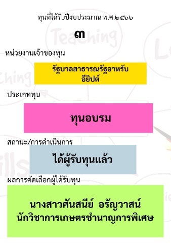 ี ุ ทนทไดรับปงบประมาณ พ.ศ.๒๕๖๖ ้ ๓ ้ ุ หน่วยงานเจาของทน รัฐบาลสาธารณรัฐอาหรับ อียิปต ์ ประเภททน ุ ทุนอบรม สถานะ/การดาเนินการ ํ ้ ้ ไดผู้รับทุนแลว ื ั ุ ผลการคดเลอกผไดรับทน ู้ ้ นางสาวศันสนีย์ อรัญวาสน ์ ิ นกวชาการเกษตรชํานาญการพเศษ ั ิ