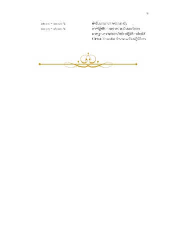 6 12:00 – 13:00 น. พักรับประทานอาหารกลางวัน 13:00 – 16:00 น. ภาคปฏิบัติ: การตรวจประเมินและรับรอง มาตรฐานความปลอดภัยห้องปฏิบัติการโดยใช้ ESPReL Checklist จำนวน 3 ห้องปฏิบัติการ