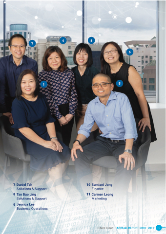 7 48 7 Daniel Teh Solutions & Support 8 Tan Bao Ling Solutions & Support 9 Jessica Lee Business Operations 10 Sumiani Jong Finance 11 Carmen Leong Marketing 1 6 5 iShine Cloud | ANNUAL REPORT 2018–2019 15
