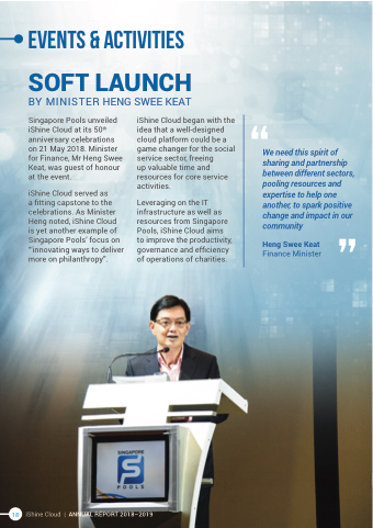 Leveraging on the IT infrastructure as well as resources from Singapore Pools, iShine Cloud aims to improve the productivity, governance and e ciency of operations of charities.