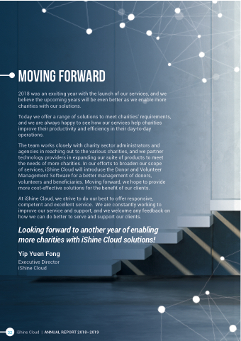 The team works closely with charity sector administrators and agencies in reaching out to the various charities, and we partner technology providers in expanding our suite of products to meet the needs of more charities. In our efforts to broaden our scope of services, iShine Cloud will introduce the Donor and Volunteer Management Software for a better management of donors, volunteers and bene ciaries. Moving forward, we hope to provide more cost-effective solutions for the bene t of our clients.