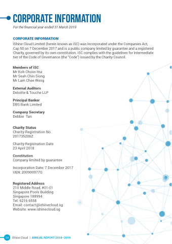 iShine Cloud Limited (herein known as iSC) was incorporated under the Companies Act, Cap 50 on 7 December 2017 and is a public company limited by guarantee and a registered Charity, governed by its own constitution. iSC complies with the guidelines for intermediate tier of the Code of Governance (the “Code”) issued by the Charity Council.