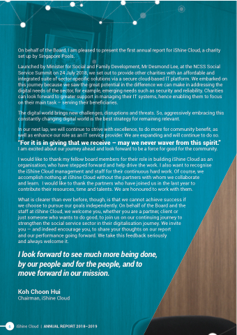 What is clearer than ever before, though, is that we cannot achieve success if we choose to pursue our goals independently. On behalf of the Board and the staff at iShine Cloud, we welcome you, whether you are a partner, client or just someone who wants to do good, to join us on our continuing journey to strengthen the social service sector in their digitalisation journey. We invite you — and indeed encourage you, to share your thoughts on our report