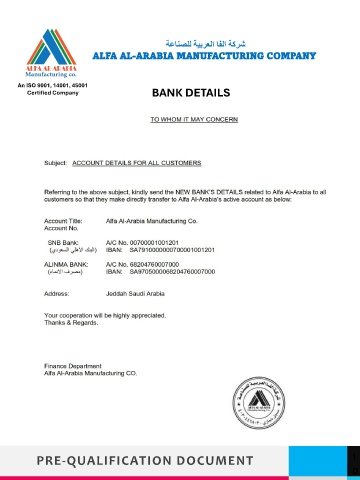 ةعانصلل ةيبرعلا افلا ةكرش ALFA AL-ARABIA MANUFACTURING COMPANY An ISO 9001, 14001, 45001 Certified Company BANK DETAILS 1 PRE-QUALIFICATION DOCUMENT TREY 100 research 0 0