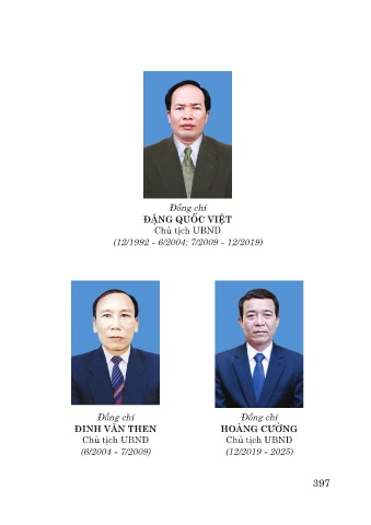 Đồng chí ĐẶNG QUỐC VIỆT Chủ tịch UBND (12/1992 - 6/2004; 7/2009 - 12/2019) Đồng chí Đồng chí ĐINH VĂN THEN HOÀNG CƯỜNG Chủ tịch UBND Chủ tịch UBND (6/2004 - 7/2009) (12/2019 - 2025) 397