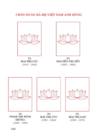 CHÂN DUNG BÀ MẸ VIỆT NAM ANH HÙNG Mẹ Mẹ MAI THỊ CÚC NGUYỄN THỊ NẾT (1912 - 1945) (1925 - 1964) Mẹ Mẹ Mẹ Mẹ PHẠM THỊ RĨNH MAI THỊ CÚC MAI THỊ GAN NGUYỄN THỊ TỲ (RŨNG) (1895 - 1945) (1898 - 1975) (1909 - 1975) (1909 - 1980) 426