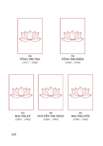 Mẹ Mẹ TỐNG THỊ TẸO TỐNG THỊ RIÊM (1917 - 1962) (1906 - 1948) Mẹ NGUYỄN THỊ KHUYÊN (1921 - 2015) Mẹ Mẹ Mẹ MAI THỊ KỲ NGUYỄN THỊ THÂN MAI THỊ GIỚI Mẹ (1902 - 1982) (1920 - 1963) (1890 - 1945) PHẠM THỊ GÁI (1918 - 1980) 428