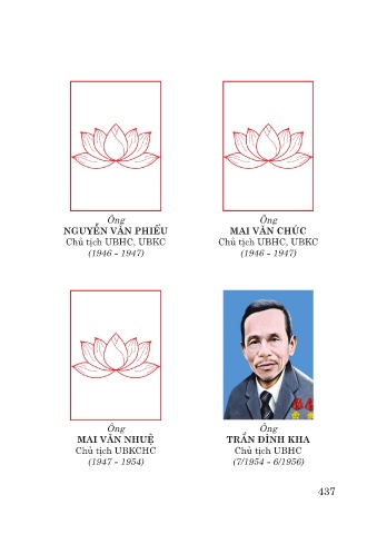 Ông Ông NGUYỄN VĂN PHIẾU MAI VĂN CHÚC Chủ tịch UBHC, UBKC Chủ tịch UBHC, UBKC (1946 - 1947) (1946 - 1947) Ông Ông MAI VĂN NHUỆ TRẦN ĐÌNH KHA Chủ tịch UBKCHC Chủ tịch UBHC (1947 - 1954) (7/1954 - 6/1956) 437