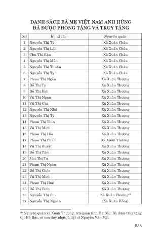(1) Nguyên quán xã Xuân Thượng, trú quán tỉnh Hà Bắc. Bà được truy tặng