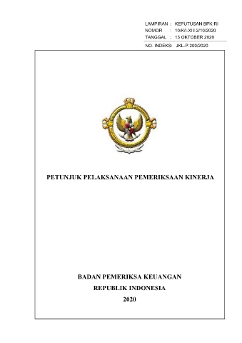 LAMPIRAN : KEPUTUSAN BPK-RI NOMOR : 10/K/I-XIII.2/10/2020 TANGGAL : 13 OKTOBER 2020 NO. INDEKS JKL-P.200/2020 PETUNJUK PELAKSANAAN PEMERIKSAAN KINERJA BADAN PEMERIKSA KEUANGAN REPUBLIK INDONESIA 2020