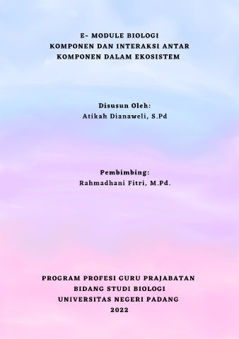 E- MODULE BIOLOGI KOMPONEN DAN INTERAKSI ANTAR KOMPONEN DALAM EKOSISTEM Disusun Oleh: Atikah Dianaweli, S.Pd Pembimbing: Rahmadhani Fitri, M.Pd. PROGRAM PROFESI GURU PRAJABATAN BIDANG STUDI BIOLOGI UNIVERSITAS NEGERI PADANG 2022