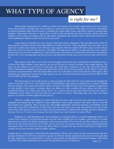 specialize in certain areas of police work. However, larger agencies often have higher call loads in patrol, and the officers