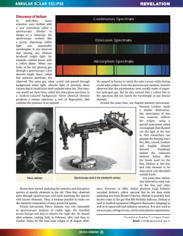 He camped in Guntur to watch the solar corona visible during a total solar eclipse. From the spectroscopic analysis, Janssen observed that the prominences were mostly made of super- hot hydrogen gas. But he also noticed that a yellow line in the spectrum did not match the wavelength of any known element.