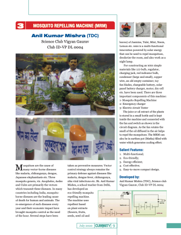 taken as preventive measures. Vector control strategy always remains the primary defense against diseases like malaria, dengue fever, chikungunya, zika viral infections etc. Sh. Anil Kumar Mishra, a school teacher from Delhi, has developed an