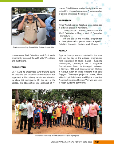 On 14 and 15 December 2019 training camp for teachers and science communicators was organised at Puducherry, which was attended by about 60 participants. On the day of the eclipse, the observation was arranged at 44