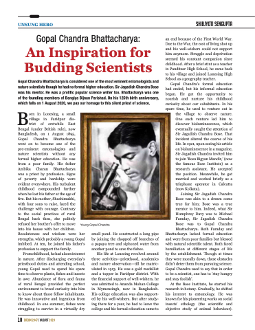 UNSUNG HERO Gopal Chandra Bhattacharya: An Inspiration for Budding Scientists Gopal Chandra Bhattacharya is considered one of the most eminent entomologists and nature scientists though he had no formal higher education. Sir Jagadish Chandra Bose was his mentor. He was a prolific popular science writer too. Bhattacharya was one of the founding members of Bangiya Bijnan Parishad. On his 125th birth anniversary, which falls on 1 August 2020, we pay our homage to this silent priest of science. Born in Lonesing, a small village in Faridpur dis- trict of erstwhile East Bengal (under British rule), now Bangladesh, on 1 August 1895, Gopal Chandra Bhattacharya went on to become one of the pre-eminent entomologists and nature scientists without any formal higher education. He was from a poor family. His father Ambika Charan Bhattacharya was a priest by profession. Signs of poverty and hardship were evident everywhere. His turbulent childhood compounded further when he lost his father at the age of five. But his mother, Shashimukhi, with four sons to raise, faced the challenge with courage. Contrary to the social practices of rural Bengal back then, she politely refused her brother’s offer to move into his house with her children. Resoluteness and wisdom were her strengths, which probably a young Gopal imbibed. At ten, he joined his father’s profession to support the family. From childhood, he had a keen interest in nature. After discharging everyday’s priesthood duties and attending school, young Gopal used to spend his spare time to observe plants, fishes and insects in awe. Abundance of flora and fauna of rural Bengal provided the perfect environment to breed curiosity into him to know about those fellow inhabitants. He was innovative and ingenious from childhood. In one summer, fishes were struggling to survive in a virtually dry Shibjyoti Sengupta Young Gopal Chandra an end because of the First World War. Due to the War, the cost of living shot up and his well-wishers could not support him anymore. Struggle and deprivation seemed his constant companion since childhood. After a brief stint as a teacher in Panditsar High School, he came back to his village and joined Lonesing High School as a geography teacher. Gopal Chandra’s formal education had ended, but his informal education began. He got the opportunity to nourish and nurture his childhood curiosity about our cohabitants. In his spare time, he used to venture out in the village to observe nature. One such venture led him to discover bioluminescence, which eventually caught the attention of Sir Jagadish Chandra Bose. That incident altered the course of his life. In 1921, upon seeing his article on bioluminescence in a magazine, Sir Jagadish Chandra invited him to join ‘Bosu Bigyan Mandir,’ (now the famous Bose Institute) as a research assistant. He accepted the position. Meanwhile, he got married and worked briefly as a telephone operator in Calcutta (now Kolkata). Joining Sir Jagadish Chandra Bose was akin to a dream come true for him; Bose was a true mentor to him. Indeed, what Sir Humphrey Davy was to Michael Faraday, Sir Jagadish Chandra Bose was to Gopal Chandra Bhattacharya. Both Faraday and Bhattacharya lacked formal education and were from poor families but blessed with natural scientific talent. Both faced humiliation at different stages of life by the establishment. Though at times they were morally down, these obstacles didn’t deter them from pursuing science. Gopal Chandra used to say that in order to be a scientist, one has to ‘stay hungry and stay foolish’. At the Bose Institute, he started his research in botany. Gradually, he shifted his interest to entomology. He was known for his pioneering works on social insects’ ethology (the scientific and objective study of animal behaviour). small pond. He constructed a long pipe by joining the chopped off branches of a papaya tree and siphoned water from another pond to save the fishes. His life at Lonesing revolved around three activities—priesthood, academics and nature observation—till he matric- ulated in 1913. He was a gold medallist and a topper in Faridpur district. With the financial support of well-wishers, he was admitted to Ananda Mohan College in Mymensingh, now in Bangladesh. His college education was also support- ed by his well-wishers. But after study- ing there for a year, he had to leave the college and his formal education came to 10 dream2047/august2020