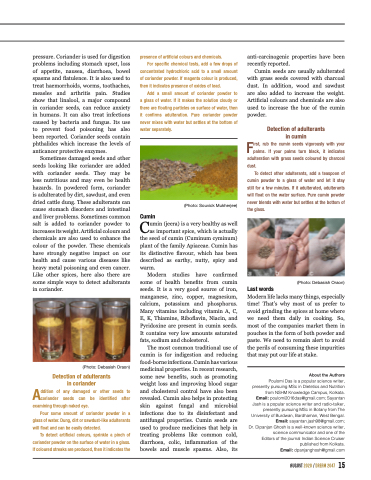 pressure. Coriander is used for digestion problems including stomach upset, loss of appetite, nausea, diarrhoea, bowel spasms and flatulence. It is also used to treat haemorrhoids, worms, toothaches, measles and arthritis pain. Studies show that linalool, a major compound in coriander seeds, can reduce anxiety in humans. It can also treat infections caused by bacteria and fungus. Its use to prevent food poisoning has also been reported. Coriander seeds contain phthalides which increase the levels of anticancer protective enzymes. Sometimes damaged seeds and other seeds looking like coriander are added with coriander seeds. They may be less nutritious and may even be health hazards. In powdered form, coriander is adulterated by dirt, sawdust, and even dried cattle dung. These adulterants can cause stomach disorders and intestinal and liver problems. Sometimes common salt is added to coriander powder to increases its weight. Artificial colours and chemicals are also used to enhance the colour of the powder. These chemicals have strongly negative impact on our health and cause various diseases like heavy metal poisoning and even cancer. Like other spices, here also there are some simple ways to detect adulterants in coriander. (Photo: Debasish Oraon) Detection of adulterants in coriander Addition of any damaged or other seeds to coriander seeds can be identified after examining through naked eye. Pour some amount of coriander powder in a glass of water. Dung, dirt or sawdust-like adulterants will float and can be easily detected. To detect artificial colours, sprinkle a pinch of coriander powder on the surface of water in a glass. If coloured streaks are produced, then it indicates the presence of artificial colours and chemicals. For specific chemical tests, add a few drops of concentrated hydrochloric acid to a small amount of coriander powder. If magenta colour is produced, then it indicates presence of oxides of lead. Add a small amount of coriander powder to a glass of water. If it makes the solution cloudy or there are floating particles on surface of water, then it confirms adulteration. Pure coriander powder never mixes with water but settles at the bottom of water separately. (Photo: Souvick Mukherjee) Cumin umin (jeera) is a very healthy as well as important spice, which is actually the seed of cumin (Cuminum cyminum) plant of the family Apiaceae. Cumin has its distinctive flavour, which has been described as earthy, nutty, spicy and warm. Modern studies have confirmed some of health benefits from cumin seeds. It is a very good source of iron, manganese, zinc, copper, magnesium, calcium, potassium and phosphorus. Many vitamins including vitamin A, C, E, K, Thiamine, Riboflavin, Niacin, and Pyridoxine are present in cumin seeds. It contains very low amounts saturated fats, sodium and cholesterol. The most common traditional use of cumin is for indigestion and reducing food-borne infections. Cumin has various medicinal properties. In recent research, some new benefits, such as promoting weight loss and improving blood sugar and cholesterol control have also been revealed. Cumin also helps in protecting skin against fungal and microbial infections due to its disinfectant and antifungal properties. Cumin seeds are used to produce medicines that help in treating problems like common cold, diarrhoea, colic, inflammation of the bowels and muscle spasms. Also, its anti-carcinogenic properties have been recently reported. Cumin seeds are usually adulterated with grass seeds covered with charcoal dust. In addition, wood and sawdust are also added to increase the weight. Artificial colours and chemicals are also used to increase the hue of the cumin powder. Detection of adulterants F in cumin irst, rub the cumin seeds vigorously with your palms. If your palms turn black, it indicates adulteration with grass seeds coloured by charcoal dust. To detect other adulterants, add a teaspoon of cumin powder to a glass of water and let it stay still for a few minutes. If it adulterated, adulterants will float on the water surface. Pure cumin powder never blends with water but settles at the bottom of the glass. Last words (Photo: Debasish Oraon) Modern life lacks many things, especially time! That’s why most of us prefer to avoid grinding the spices at home where we need them daily in cooking. So, most of the companies market them in pouches in the form of both powder and paste. We need to remain alert to avoid the perils of consuming these impurities that may put our life at stake. About the Authors Poulomi Das is a popular science writer, presently pursuing MSc in Dietetics and Nutrition from NSHM Knowledge Campus, Kolkata. Email: poulomi2016das@gmail.com; Sayantan Jash is a popular science writer and radio-talker, presently pursuing MSc in Botany from The University of Burdwan, Bardhaman, West Bengal. Email: sayantan.jash98@gmail.com; Dr. Dipanjan Ghosh is a well-known science writer, science communicator and one of the Editors of the journal Indian Science Cruiser published from Kolkata. Email: dpanjanghosh@gmail.com august2020/dream2047 15