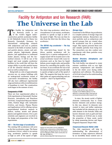 DEVELOPMENT Jyoti Sharma and Sanjeev Kumar Varshney Facility for Antiproton and Ion Research (FAIR): T The Universe in the Lab he Facility for Antiproton and The SIS18 ring accelerator, which has a Storage rings Ion Research (FAIR) is one circumference of 216 metres, accelerates Connected to the SIS100 ring accelerator of the world’s biggest under- particles to speeds as high as 90% of is a complex system of storage rings and construction particle accelerator facility at GSI Helmholtz Centre for Heavy Ion Research, Darmstadt, Germany, for international cutting-edge research with antiprotons and ions to perform research in the fields of nuclear, hadron and particle physics, atomic and anti- matter physics, high-density plasma physics, and applications in condensed matter physics, biology and the bio- medical sciences. It will be one of the largest and most complex accelerator facilities in the world that will have the unique ability to provide particle beams of all the chemical elements (or their ions) as well as antiprotons. Being built on a site of approximately 150,000 m2, 25 unique buildings with an underground accelerator tunnel of 1,100-metre circumference, the facility will also have additional experimental rings and stations with several kilometres of beamlines in total. The construction work began in the summer of 2017. Components of FAIR There are four experimental pillars in FAIR experiments at Darmstadt: Nuclear Structure, Astrophysics and Reactions (NUSTAR), Compressed Baryonic Matter (CBM), Particle Magic with Antimatter (PANDA), and Atomic, Plasma Physics and Applications (APPA) offering various unprecedented forefront research in hadron, nuclear, atomic and plasma physics and applied sciences. Over 2,500 scientists and engineers are involved in the design and preparation of the FAIR experiments. GSI — The first stage of acceleration The existing GSI accelerators will serve as the first acceleration stage. The linear accelerator UNILAC, which is 120 metres long, accelerates particles to speeds as high as 20% of the speed of light. 16 dream 2047 / august 2020 the speed of light. The ions can then be shot from the SIS18 into the SIS100 ring accelerator. The SIS100 ring accelerator – The key component The 1100-metre-long tunnel for the SIS100 particle accelerator will be located up to 17 metres underground. A supply tunnel will be located next to the actual accelerator tunnel with room for structures such as the lines for liquid helium, power supply units, and possible devices for controlling the quality of the ion beam. It can accelerate the ions of all the natural elements in the periodic table to speeds as high as 99% of the speed of light. The magnets that keep the ions in their paths are superconducting and are cooled to —269°C by liquid helium. Facility for Anti proton and Ion Research (FAIR) under construction at GSI (https://www. researchgate.net/figure/Facility-for-Anti-proton- and-Ion-Research-FAIR-under-construction-at GSI_fig6_297368774; picture-alliance/dpa/GSI Helmholtzzentrum) experimental stations. Researchers can store particles such as antiprotons and special isotopes that are created when the accelerated ions hit a production target. This capture prevents these rare and valuable particles from being lost. The researchers can also conduct new experiments with these particles every time they fly past. Nuclear Structure, Astrophysics and Reactions (NUSTAR) The FAIR facility was planned to create extreme conditions such as very high pressure, temperatures and densities in the lab which occur during stellar explosions and collisions. The planning of NUSTAR is based on the understanding of atomic nuclei. Exotic nuclei and the heavy element Crystals of the PANDA detector for the detection of particles (https://www.gsi.de/ en/researchaccelerators/fair/research.htm In stars, the atomic nuclei of lighter elements continuously fuse to create heavier elements and produce energy. In this way, almost 70 elements were created in stars and stellar explosions that included all the elements up to the 26th element in the Periodic Table and heavier elements such as gold and lead. The scientists at NUSTAR aim to study the properties of these exotic nuclei by using measuring devices and Super Fragment Separator (Super-FRS). Compressed Baryonic Matter (CBM) The CBM experiment will help in understanding the phenomenon of formation of huge supernova followed by an incredibly dense central core of