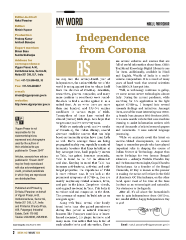 Editor-in-Chief: Nakul Parashar Editor: Nimish Kapoor Production: Pradeep Kumar Amitesh Banerjee Expert member: Biman Basu Sumita Mukherjee Address for correspondence: Vigyan Prasar, A-50, Institutional Area, Sector-62, Noida-201 309, U.P., India Tel: +91-120-2404430, 35 Fax: +91-120-2404437 e-mail: dream@vigyanprasar.gov.in website: http://www.vigyanprasar.gov.in Vigyan Prasar is not responsible for the statements/opinions expressed and photographs used by the authors in their articles/write-ups published in “Dream 2047” Articles, excerpts from articles published in “Dream 2047” may be freely reproduced with due acknowledgement/ credit, provided periodicals in which they are reproduced are distributed free. Published and Printed by Dr Nakul Parashar on behalf of Vigyan Prasar, A-50, Institutional Area, Sector-62, Noida-201 309, U.P., India and Printed at Chandu Press, 469, Patparganj Industrial Estate, Delhi 110 092 Telefax: 22424396, 22526936. Cover Design By: ANURADHA SEN 2 dream 2047 / august 2020 Nakul Parashar Independence from Corona as we step into the seventy-fourth year of independence, the nation with the rest of the world is racing against time to release itself from the clutches of COVID-19. Scientists, researchers, pharma companies, and many more continue to relentlessly work round- the-clock to find a vaccine against it, as a united front. As we write, there are more than one hundred and fifty-five vaccine candidates in various stages of trials. Twenty-three of these have reached the clinical (human) trials stage. Let’s hope that we get some positive news very soon. While we anxiously await positive results of Covaxin-19, the Indian attempt, several alternate medicine sources that can help boost our immunity system have come forth as well. Herbs amongst these are being propagated in a big way, especially as natural immunity boosters that keep infections at bay. Amongst these, Basil, popularly known as Tulsi, has gained immense popularity. Tulsi is found to be rich in vitamin-C and zinc. Keeping in mind that Tulsi has immense anti-bacterial, anti-viral and anti- fungal properties, the importance of Tulsi is more relevant now. If you look at the prominent symptoms of COVID-19, they are mainly respiratory-related ailments, fever, and pain in the joints. Camphene, cineole, and eugenol are found in Tulsi. This helps it to reduce cold and congestion in the chest. The presence of eugenol in Tulsi acts as an analgesic agent. Along with Tulsi, several other locally found herbs have also gained prominence during this period as natural immunity boosters like Tinospora cordifolia or heart- leaved moonseed, dry ginger, turmeric, and many more. Our nation that way is full of such valuable herbs and information. There are several websites and sources that are full of useful information about them. CSIR’s Traditional Knowledge Digital Library is one for them. Additionally, available in Hindi and English, Wealth of India is a multi- volume compendium. It is a result of many years of hard work that several scientists from NISCAIR have put into. Well, as technology continues to gallop, we come across newer technologies almost daily. During the current pandemic, while searching for AI’s application in the fight against COVID-19, I bumped into several research findings and initiatives. Amongst them, one of the most interesting was CORD- 19 Search from Amazon Web Services (AWS). It is a new search website that uses machine learning to assist information seekers with tens of thousands of related research papers and documents. It uses natural language processing. While we anxiously await the latest on vaccine-related developments, we cannot forget to remember people who have played important roles in shaping the course of Indian Science & Technology. August thus marks birthdays for two famous Bengali scientists – Acharya Prafulla Chandra Ray and the famous entomologist, Gopal Chandra Bhattacharya. As a founder of the Bengal Chemicals, PC Ray is known as the pioneer in making the nation self-reliant in the field of chemicals. GC Bhattacharya, on the other hand, spent most of his time at the Bose Institute as an entomologist and naturalist. Our obeisance to the legends. After all, it’s all about the humankind’s race to gain independence from COVID-19. Yet, amidst all this, happy Independence Day to you! Email: nakul.parashar@vigyanprasar.gov.in