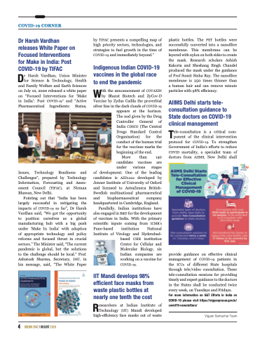 COVID-19 CORNER Dr Harsh Vardhan releases White Paper on Focused Interventions for Make in India: Post DCOVID-19 by TIFAC r Harsh Vardhan, Union Minister for Science & Technology, Health and Family Welfare and Earth Sciences on July 10, 2020 released a white paper on “Focused Interventions for ‘Make in India’: Post COVID-19” and “Active Pharmaceutical Ingredients: Status, by TIFAC presents a compelling map of high priority sectors, technologies, and strategies to fuel growth in the time of COVID-19 and immediately beyond.” Indigenous Indian COVID-19 vaccines in the global race to end the pandemic W Vaccine by Zydus Cadila the proverbial silver line in the dark clouds of COVID-19 appears at the horizon. The nod given by the Drug Controller General of India CDSCO (The Central Drugs Standard Control Organisation) for the conduct of the human trial for the vaccines marks the beginning of the end. More than 140 candidate vaccines are under various stages of development. One of the leading candidates is AZD1222 developed by Jenner Institute of University of Oxford and licensed to AstraZeneca British- Swedish multinational pharmaceutical and biopharmaceutical company headquartered in Cambridge, England. Parallelly, Indian institutions have also engaged in R&D for the development of vaccines in India. With the primary scientific inputs coming from ICMR’s Pune-based institution National Institute of Virology and Hyderabad- based CSIR institution Centre for Cellular and Molecular Biology, six Indian companies are working on a vaccine for COVID-19. IIT Mandi develops 98% efficient face masks from waste plastic bottles at nearly one tenth the cost Researchers at Indian Institute of Technology (IIT) Mandi developed high-efficiency face masks out of waste plastic bottles. The PET bottles were successfully converted into a nanofibre membrane. This membrane can be layered with nylon on both sides to create the mask. Research scholars Ashish Kakoria and Sheshang Singh Chandel produced the mask under the guidance of Prof Sumit Sinha Ray. The nanofibre membrane is 250 times thinner than a human hair and can remove minute particles with 98% efficiency. AIIMS Delhi starts tele- consultation guidance to State doctors on COVID-19 clinical management T protocol for COVID-19. To strengthen Government of India’s efforts to reduce COVID mortality, a specialist team of doctorsfromAIIMS,NewDelhishall ith the announcement of COVAXIN by Bharat Biotech and ZyCov-D ele-consultation is a critical com- ponent of the clinical intervention Issues, Technology Readiness and Challenges”, prepared by Technology Information, Forecasting and Asses- sment Council (TIFAC), at Nirman Bhawan, New Delhi. Pointing out that “India has been largely successful in mitigating the impacts of COVID-19 so far”, Dr Harsh Vardhan said, “We got the opportunity to position ourselves as a global manufacturing hub with a big push under ‘Make In India’ with adoption of appropriate technology and policy reforms and focused thrust in crucial sectors.” The Minister said, “The current pandemic is global, but the solutions to the challenge should be local.” Prof. Ashutosh Sharma, Secretary, DST, in his message, said, “The White Paper provide guidance on effective clinical management of COVID-19 patients in the ICUs of different State hospitals through tele/video consultation. These tele-consultation sessions for providing timely and expert guidance to the doctors in the States shall be conducted twice every week, on Tuesdays and Fridays. For more information on S&T Efforts in India on COVID-19 please visit https://vigyanprasar.gov.in/ covid19-newsletters/ Vigyan Samachar Team 4 dream 2047 / august 2020