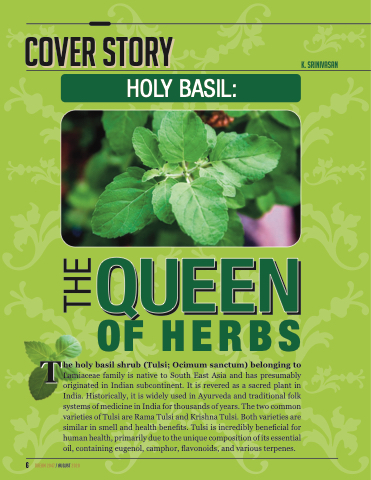 COVER STORY COVER STORY K. Srinivasan HOLY BASIL: OF HERBS he holy basil shrub (Tulsi; Ocimum sanctum) belonging to Lamiaceae family is native to South East Asia and has presumably originated in Indian subcontinent. It is revered as a sacred plant in India. Historically, it is widely used in Ayurveda and traditional folk systems of medicine in India for thousands of years. The two common varieties of Tulsi are Rama Tulsi and Krishna Tulsi. Both varieties are similar in smell and health benefits. Tulsi is incredibly beneficial for human health, primarily due to the unique composition of its essential oil, containing eugenol, camphor, flavonoids, and various terpenes. 6 dream 2047 / august 2020