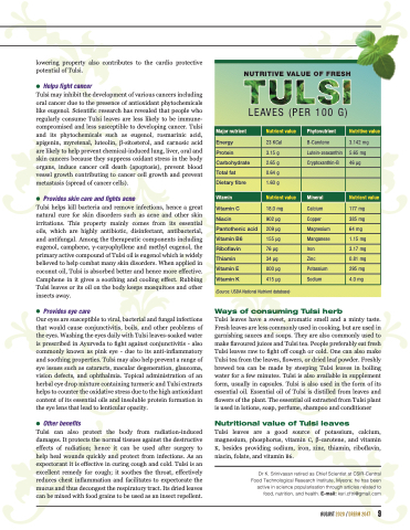 lowering property also contributes to the cardio protective potential of Tulsi. Helps fight cancer Tulsi may inhibit the development of various cancers including oral cancer due to the presence of antioxidant phytochemicals like eugenol. Scientific research has revealed that people who regularly consume Tulsi leaves are less likely to be immune- compromised and less susceptible to developing cancer. Tulsi and its phytochemicals such as eugenol, rosmarinic acid, apigenin, myretenal, luteolin, β-sitosterol, and carnosic acid are likely to help prevent chemical-induced lung, liver, oral and skin cancers because they suppress oxidant stress in the body organs, induce cancer cell death (apoptosis), prevent blood vessel growth contributing to cancer cell growth and prevent metastasis (spread of cancer cells). Provides skin care and fights acne Tulsi helps kill bacteria and remove infections, hence a great natural cure for skin disorders such as acne and other skin irritations. This property mainly comes from its essential oils, which are highly antibiotic, disinfectant, antibacterial, and antifungal. Among the therapeutic components including eugenol, camphene, γ-caryophyllene and methyl eugenol, the primary active compound of Tulsi oil is eugenol which is widely believed to help combat many skin disorders. When applied in coconut oil, Tulsi is absorbed better and hence more effective. Camphene in it gives a soothing and cooling effect. Rubbing Tulsi leaves or its oil on the body keeps mosquitoes and other insects away. Provides eye care Our eyes are susceptible to viral, bacterial and fungal infections that would cause conjunctivitis, boils, and other problems of the eyes. Washing the eyes daily with Tulsi leaves-soaked water is prescribed in Ayurveda to fight against conjunctivitis - also commonly known as pink eye - due to its anti-inflammatory and soothing properties. Tulsi may also help prevent a range of eye issues such as cataracts, macular degeneration, glaucoma, vision defects, and ophthalmia. Topical administration of an herbal eye drop mixture containing turmeric and Tulsi extracts helps to counter the oxidative stress due to the high antioxidant content of its essential oils and insoluble protein formation in the eye lens that lead to lenticular opacity. Other benefits Tulsi can also protect the body from radiation-induced damages. It protects the normal tissues against the destructive effects of radiation; hence it can be used after surgery to help heal wounds quickly and protect from infections. As an expectorant it is effective in curing cough and cold. Tulsi is an excellent remedy for cough; it soothes the throat, effectively reduces chest inflammation and facilitates to expectorate the mucus and thus decongest the respiratory tract. Its dried leaves can be mixed with food grains to be used as an insect repellent. Ways of consuming Tulsi herb Tulsi leaves have a sweet, aromatic smell and a minty taste. Fresh leaves are less commonly used in cooking, but are used in garnishing sauces and soups. They are also commonly used to make flavoured juices and Tulsi tea. People preferably eat fresh Tulsi leaves raw to fight off cough or cold. One can also make Tulsi tea from the leaves, flowers, or dried leaf powder. Freshly brewed tea can be made by steeping Tulsi leaves in boiling water for a few minutes. Tulsi is also available in supplement form, usually in capsules. Tulsi is also used in the form of its essential oil. Essential oil of Tulsi is distilled from leaves and flowers of the plant. The essential oil extracted from Tulsi plant is used in lotions, soap, perfume, shampoo and conditioner Nutritional value of Tulsi leaves Tulsi leaves are a good source of potassium, calcium, magnesium, phosphorus, vitamin C, β-carotene, and vitamin K, besides providing sodium, iron, zinc, thiamin, riboflavin, niacin, folate, and vitamin B6. Dr K. Srinivasan retired as Chief Scientist at CSIR-Central Food Technological Research Institute, Mysore; he has been active in science popularisation through articles related to food, nutrition, and health. E-mail: ksri.cftri@gmail.com NUTRITIVE VALUE OF FRESH LEAVES (PER 100 G) Major nutrient Nutrient value Phytonutrient Nutritive value Energy 23 KCal B-Carotene 3.142 mg Protein 3.15 g Lutein-zeaxanthin 5.65 mg Carbohydrate 2.65 g Cryptoxanthin-B 46 μg Total fat 0.64 g Dietary fibre 1.60 g Vitamin Nutrient value Mineral Nutrient value Vitamin C 18.0 mg Calcium 177 mg Niacin 902 μg Copper 385 mg Pantothenic acid 209 μg Magnesium 64 mg Vitamin B6 155 μg Manganese 1.15 mg Riboflavin 76 μg Iron 3.17 mg Thiamin 34 μg Zinc 0.81 mg Vitamin E 800 μg Potassium 295 mg Vitamin K 415 μg Sodium 4.0 mg (Source: USDA National Nutrient database) august 2020 / dream 2047 9