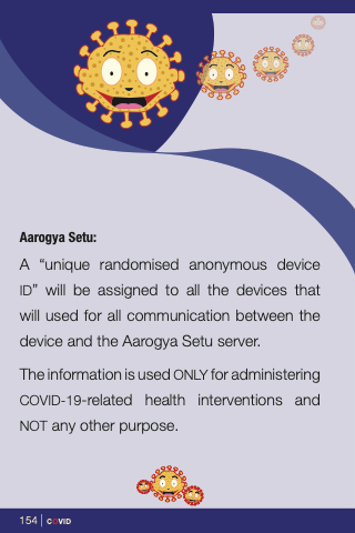 A “unique randomised anonymous device ID” will be assigned to all the devices that will used for all communication between the device and the Aarogya Setu server The information is is used ONLY for for administering COVID-19-related health interventions and NOT any other purpose 154 | COVID
