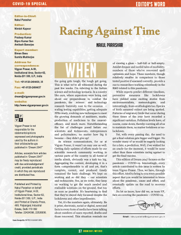 As science communicators, for us at Vigyan Prasar, it wasn't an easy one as well. Getting daily updates of efforts made by our scientific research community working in various parts of the country to all forms of media afresh, obviously was a task too big. Aggregating the content, developing it in a form comprehensible to all and yet, that's complete, correct, and produced timely remained the basic challenge. We kept on working and so did they – our scientists and technocrats. Yes, as we write, they keep on working to get the much needed and realisable solutions on the ground, that too as soon as possible. It's heartening to find that they've stayed duly focussed despite the lockdowns and other impediments.