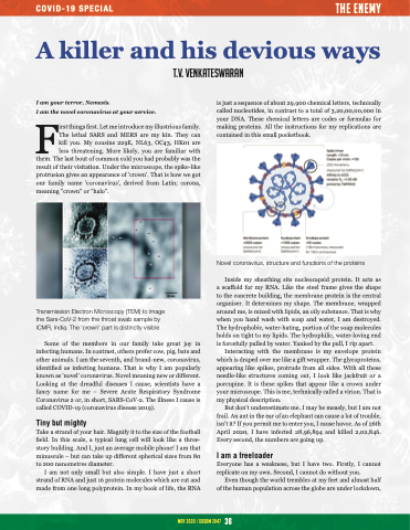 Some of the members in our family take great joy in infecting humans. In contrast, others prefer cow, pig, bats and other animals. I am the seventh, and brand-new, coronavirus, identified as infecting humans. That is why I am popularly known as 'novel' coronavirus. Novel meaning new or different. Looking at the dreadful diseases I cause, scientists have a fancy name for me – Severe Acute Respiratory Syndrome Coronavirus 2 or, in short, SARS-CoV-2. The illness I cause is called COVID-19 (coronavirus disease 2019).