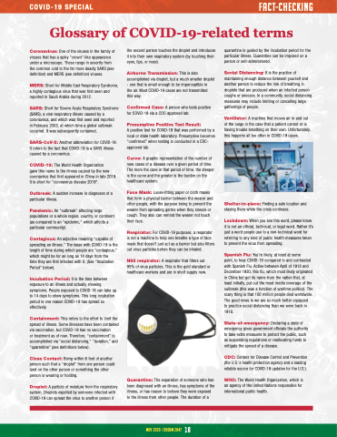 Contagious: An adjective meaning “capable of spreading an illness.” The issue with COVID-19 is the length of time during which people are “contagious,” which might be for as long as 14 days from the