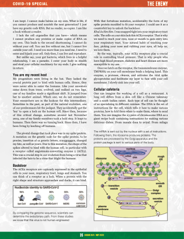 The pivotal change that took place was in my spike protein. A mutation on the genetic code for the spike protein, to be precise, insertion of 12 genetic letters, ccucggcgggca, changed my fate, as well as yours. Due to this mutation, the shape of the spikes altered to bind with the human cell, in particular with a receptor called angiotensin-converting enzyme 2 (ACE2). This was a crucial step in our evolution from being a virus that infected the bats to be a virus that blight the humans.