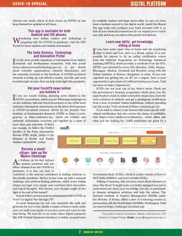 COVID-19 pandemic, either on your WhatsApp messenger or on any websites, halt and check its accuracy at one of the most authentic information repositories on the latest developments in COVID-19-related research, driven by the premier Tata Institute of Fundamental Research (TIFR) at https://covid- gyan.in/ or http://indscicov.in/, which are verified and authentic information resources put together by a team of more than 400 scientists. If that’s