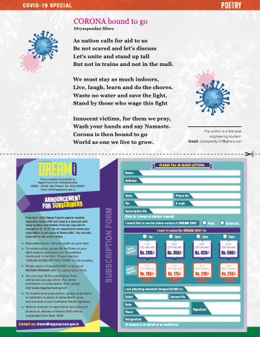 From April, 2020, Vigyan Prasar’s popular monthly newsletter Dream 2047 will come in a new look with many exciting new features. Price per copy will be changed to Rs. 20.00. You are requested to renew your subscription to get copies of Dream 2047. You can also subscribe for the online edition.