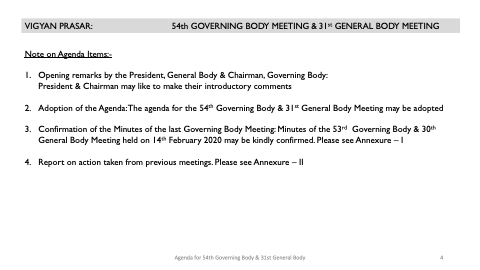1. Opening remarks by the President, General Body & Chairman, Governing Body: President & Chairman may like to make their introductory comments