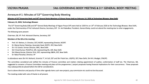 Minutes of 53rd Governing Body and 30th General Body Meetings of Vigyan Prasar held on February 14, 2020 at Technology Bhawan, New Delhi February 14, 2020, Technology Bhawan