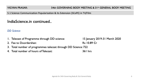 1. Telecast of Programme through DD science: 15 January 2019-31 March 2020