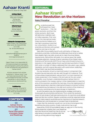 Years after the successful launch and culmination of these two revolutions, scientists, nutritionists, and dieticians have come to realize that, despite high crop yield, we are yet to meet the actual dietary requirements. Malnutrition still exists. It is a serious issue that needs immediate attention. A group of senior scientists of the Global Indian Scientist and Technocrats (GIST) Forum have come forward to launch a revolution in this regard. Aahaar Kranti was formally launched on 13 April 2021, when a number of Indians celebrated their new years. Logo, website, newsletter, and with a panel discussion with world-known celebrities, Aahaar Kranti was launched successfully.