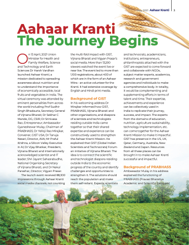 the multi-fold impact with GIST, Vijnana Bharati and Vigyan Prasar’s social media. More than 13,200 viewers watched the event live or near live. The event led to more than 1,100 registrations, about 400 of which are in the form of an Aahaar Mitra - an active volunteer for the Kranti. It had extensive coverage by English and Hindi print media.