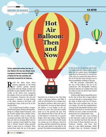 bag heats up, it starts to rise. Now they made a big paper balloon and filled it with air and heated it for a longer time, the balloon swelled a little more due to the heated air. As soon as they released the balloon, it rose higher in the air, floated for some time and then landed back on to the ground. By now they had understood that if they fill hot air in the balloon, it would rise to a greater height. Then they made a huge balloon and took it to a field, filled it with smoky air coming out of a chimney, closed its opening, and then released it by opening the rope with which it was held to the ground. The balloon immediately started