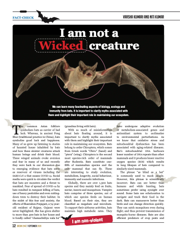 about bats floating around, it is important to clarify myths associated with them and highlight their important role in maintaining our ecosystem. Bats belong to order Chiroptera, which comes from Greek words “Chiro” (hand) and “ptera” (wing). Chiroptera is the second most species-rich order of mammals after Rodentia. Bats constitute one- fifth of mammalian species and the only mammal that can fly. These are interesting to study evolution, metabolism, longevity, social behaviour, immunity and zoonotic infections.