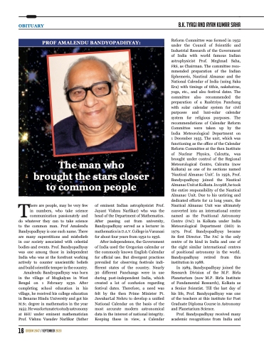 Reform Committee was formed in 1952 under the Council of Scientific and Industrial Research of the Government of India with world famous Indian astrophysicist Prof. Meghnad Saha, FRS, as Chairman. The committee reco- mmended preparation of the Indian Ephemeris, Nautical Almanac and the National Calendar of India (using Saka Era) with timings of tithis, nakshatras, yoga, etc., and also festival dates. The committee also recommended the preparation of a Rashtriya Panchang with solar calendar system for civil purposes and luni-solar calendar system for religious purposes. The recommendations of Calendar Reform Committee were taken up by the India Meteorological Department on 1 December 1955. The unit, which was functioning as the office of the Calendar Reform Committee at the then Institute of Nuclear Physics, Calcutta, was brought under control of the Regional Meteorological Centre, Calcutta (now Kolkata) as one of its sections named ʻNautical Almanac Unitʼ. In 1956, Prof. Bandyopadhyay joined the Nautical Almanac Unit at Kolkata. In 1968, he took the entire responsibility of the Nautical Almanac Unit. Due to his untiring and dedicated efforts for 12 long years, the Nautical Almanac Unit was ultimately converted into an international centre named as the Positional Astronomy Centre (PAC) in Kolkata under India Meteorological Department (IMD) in 1979. Prof. Bandyopadhyay became its first Director. The PAC is the only centre of its kind in India and one of the eight similar international centres of positional astronomy in the world. Bandyopadhyay retired from this institution in 1988.