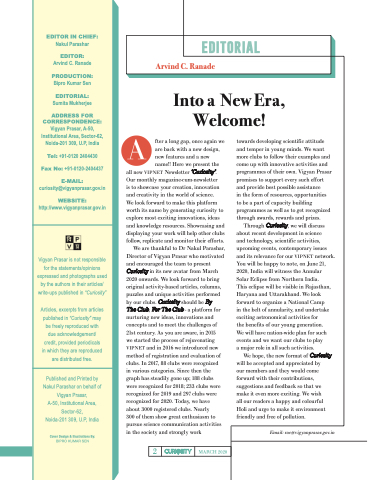 We are thankful to Dr Nakul Parashar, Director of Vigyan Prasar who motivated and encouraged the team to present Curiosity in its new avatar from March 2020 onwards. We look forward to bring original activity-based articles, columns, puzzles and unique activities performed by our clubs. Curiosity should be By