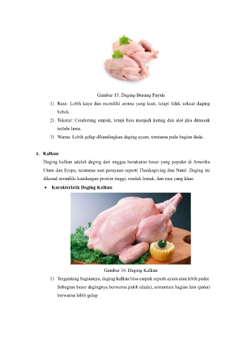 3) Warna: Lebih gelap dibandingkan daging ayam, terutama pada bagian dada.