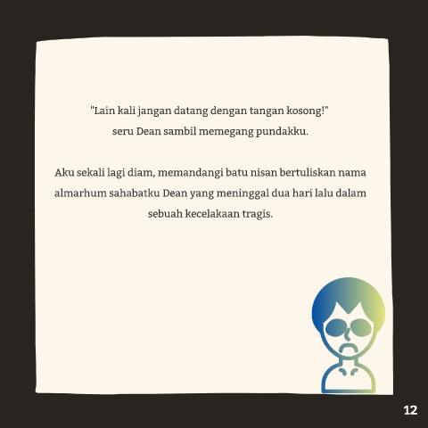 "Lain kali jangan datang dengan tangan kosong!" seru Dean sambil memegang pundakku. Aku sekali lagi diam, memandangi batu nisan bertuliskan nama almarhum sahabatku Dean yang meninggal dua hari lalu dalam sebuah kecelakaan tragis. 12