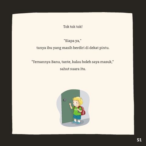 Tok tok tok! "Siapa ya," tanya ibu yang masih berdiri di dekat pintu. "Temannya Banu, tante, kalau boleh saya masuk," sahut suara itu. 51